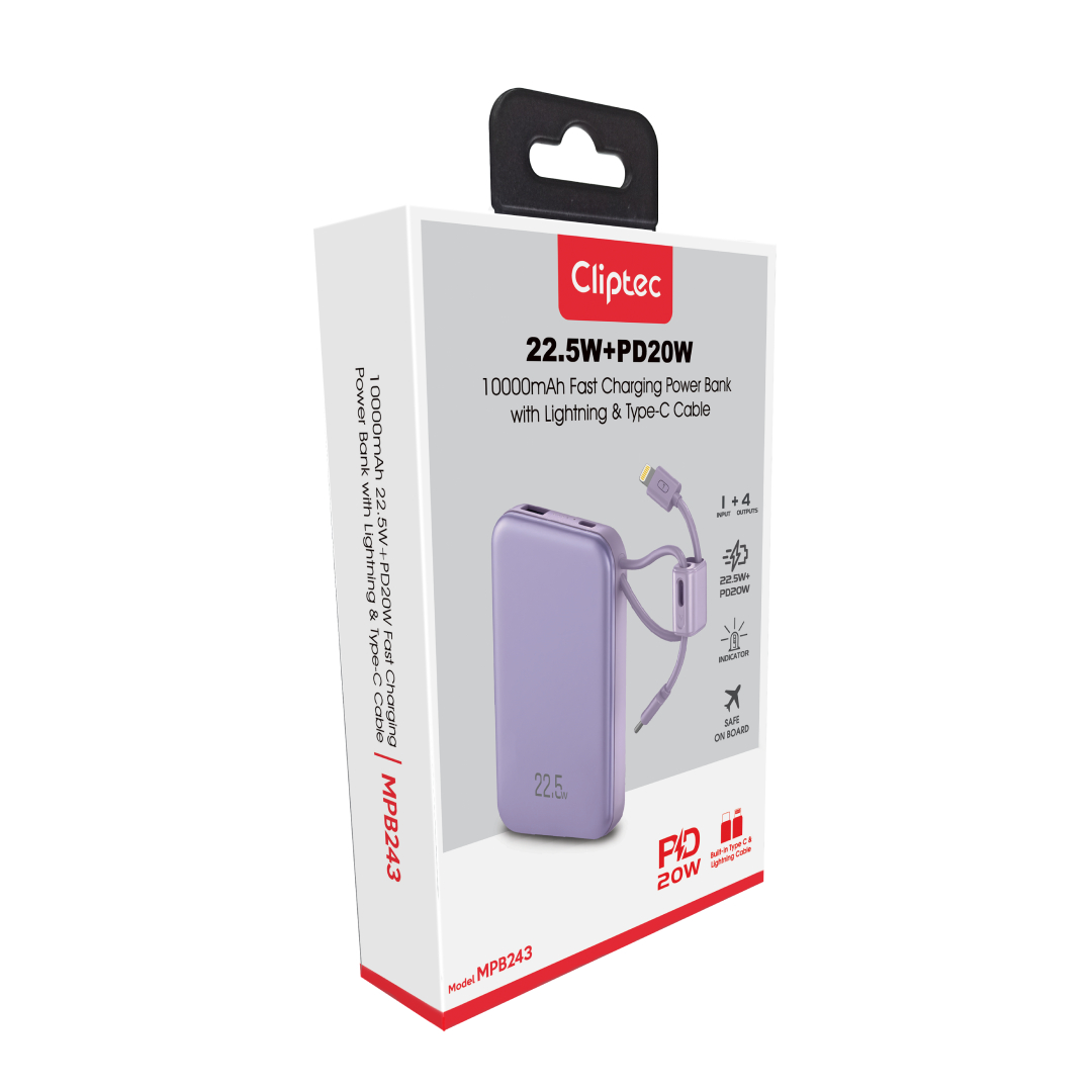 CLIPTEC MPB243 10000MAH PD20W+22.5W FAST CHARGING POWER BANK WITH TYPE-C & LIGHTNING CABLE - PURPLE