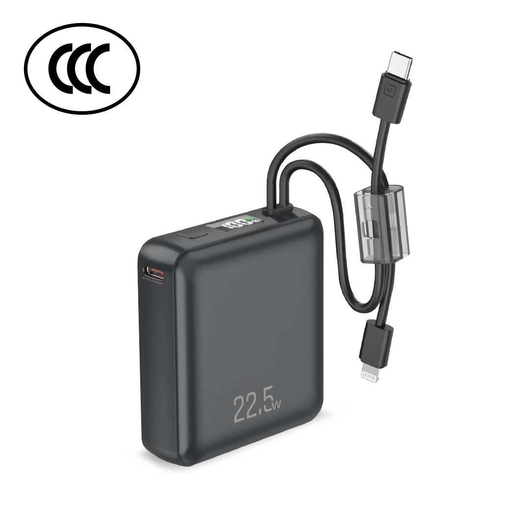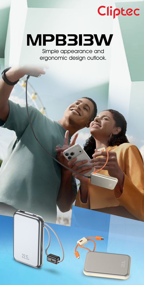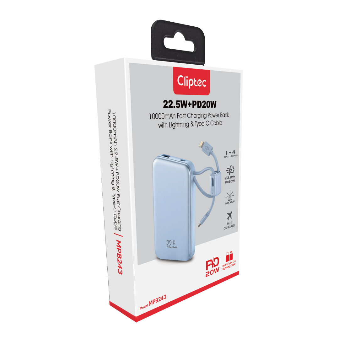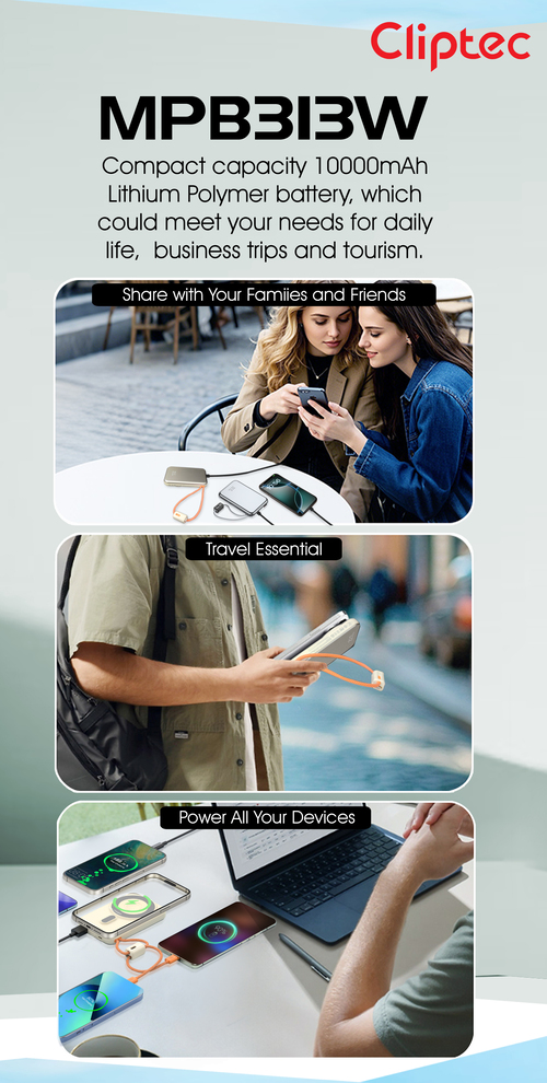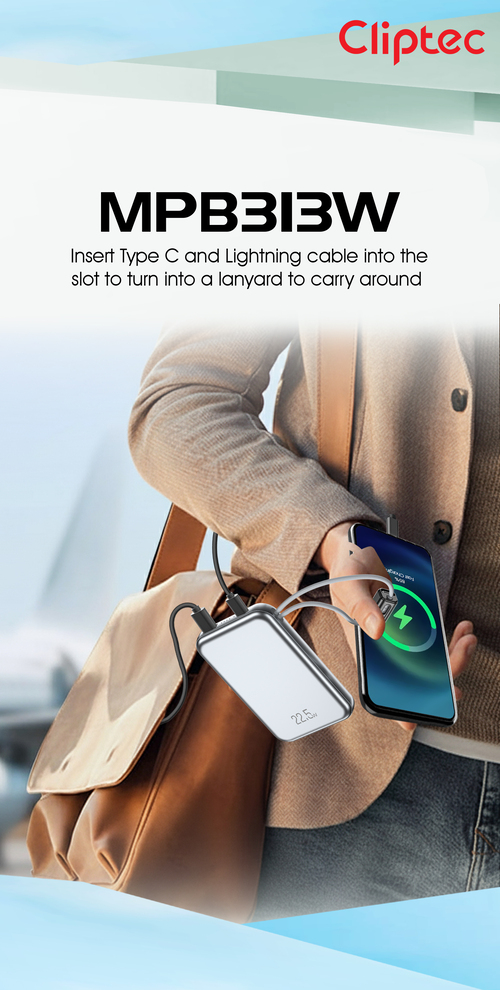 CLiPtec M-series MPB313W 10000mAh 3 in1 PD20W+15W Wireless Fast Charging Power bank with Type C and Lightning cable is an ultimate feature with 4 outputs Type C port, Type C cable, USB A output and 15W wireless output. This power bank packs a powerful 10000mAh capacity into a remarkably compact and lightweight design. Measuring just 110 x 70.3x 17.6mm and weighing only 217g, it's the perfect portable charger to take anywhere and easily fit in your pocket, wallet or handbag, making it convenient to carry and charge your mobile devices.