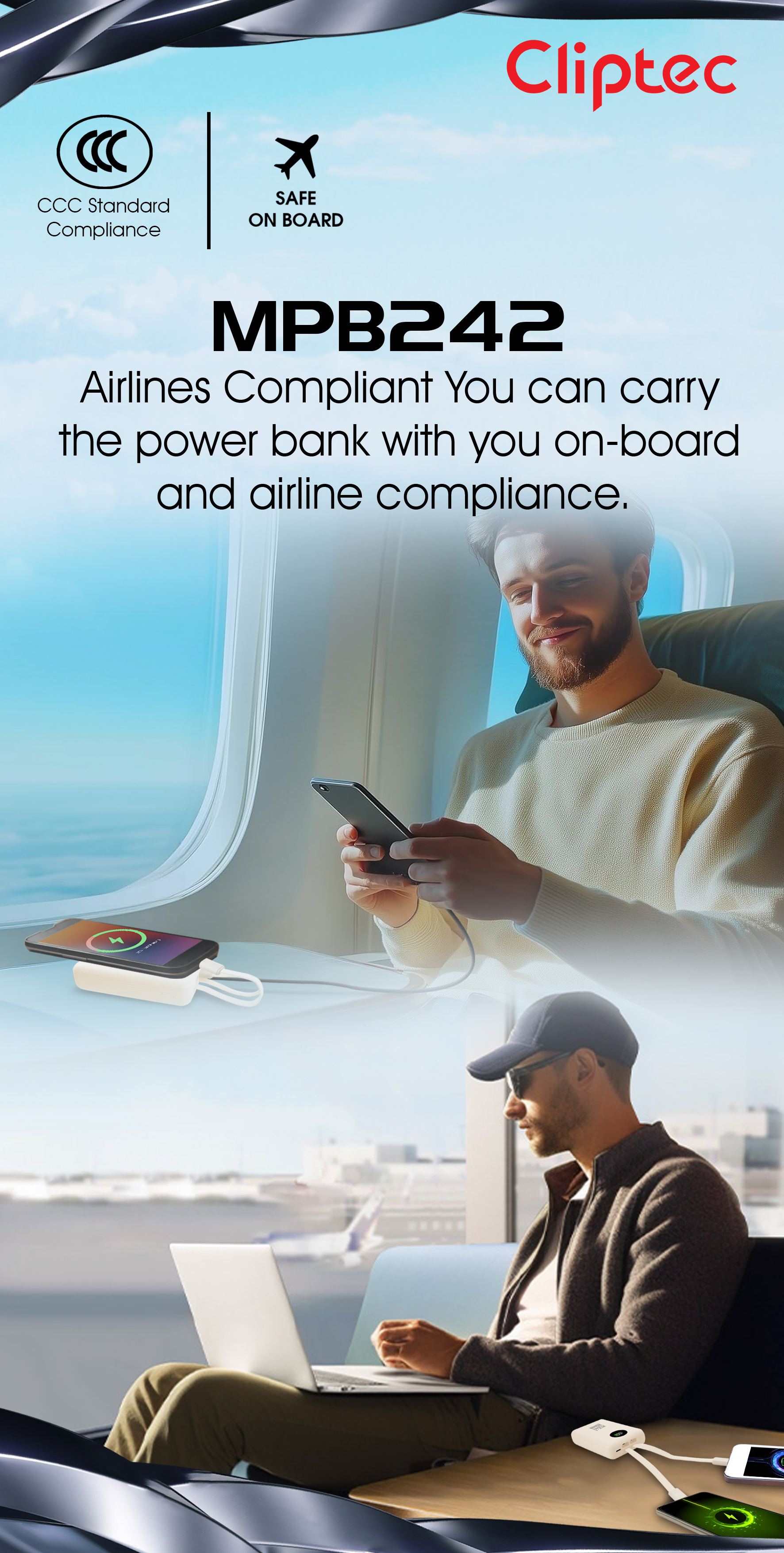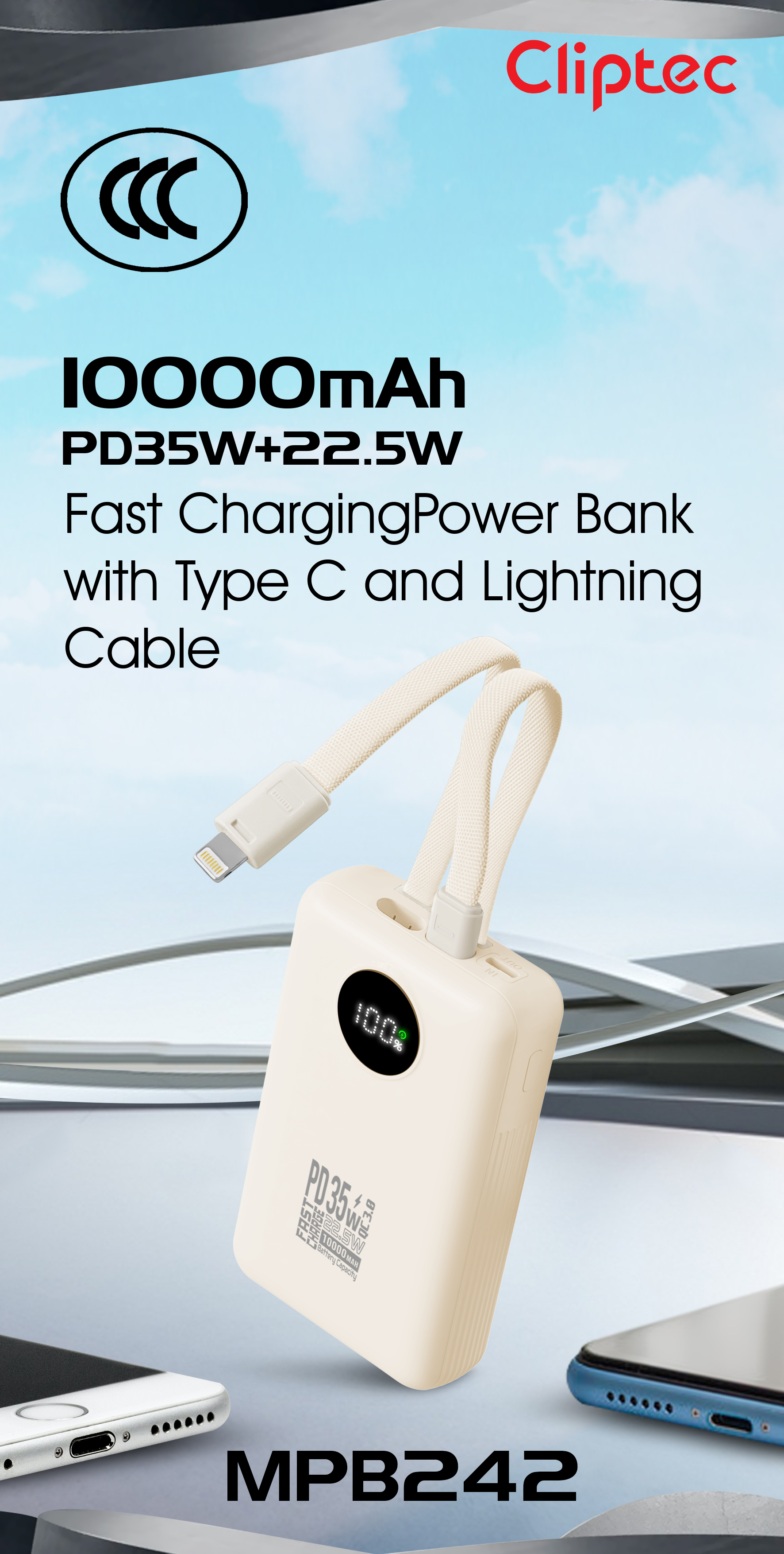 CLiPtec M-series MPB242 10000mAh PD35W Fast Charging Power bank with Type C and lightning cable is a complete with PD35W Type C cable, Lightning cable and Type C port and USB-A 22.5W high power output technology allows you to charge your smartphones and tablet even your notebook at the same time.