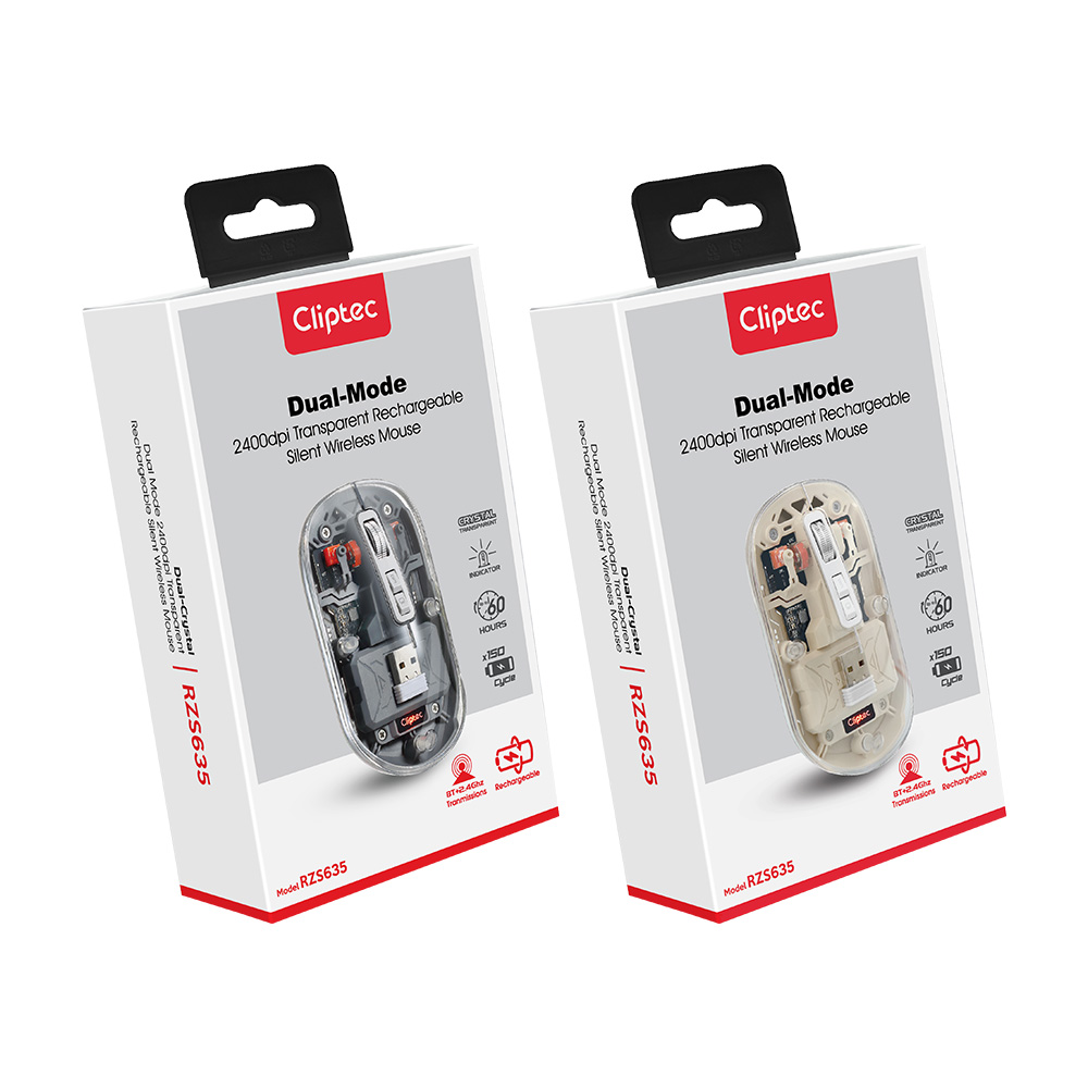 CLiPtec RZS635 Dual Mode 2400dpi Transparent Rechargeable Silent Wireless Mouse provides great cursor control for browsing documents or Internet pages. The contoured shape is suitable for either hand and the gently curved sides give your hand the support and comfort you need for all-day use. With 2.4 GHz wireless transmission is up to 10 meter of wireless range give user more freedom, no interference of movement and more comfort and control than a touchpad. Cursor speed is adjustable by the top speed-switching button, one touching to switch between 1000/1200/1600/2400dpi, a perfect functionality for wide screen users having the full speed control over the cursor.