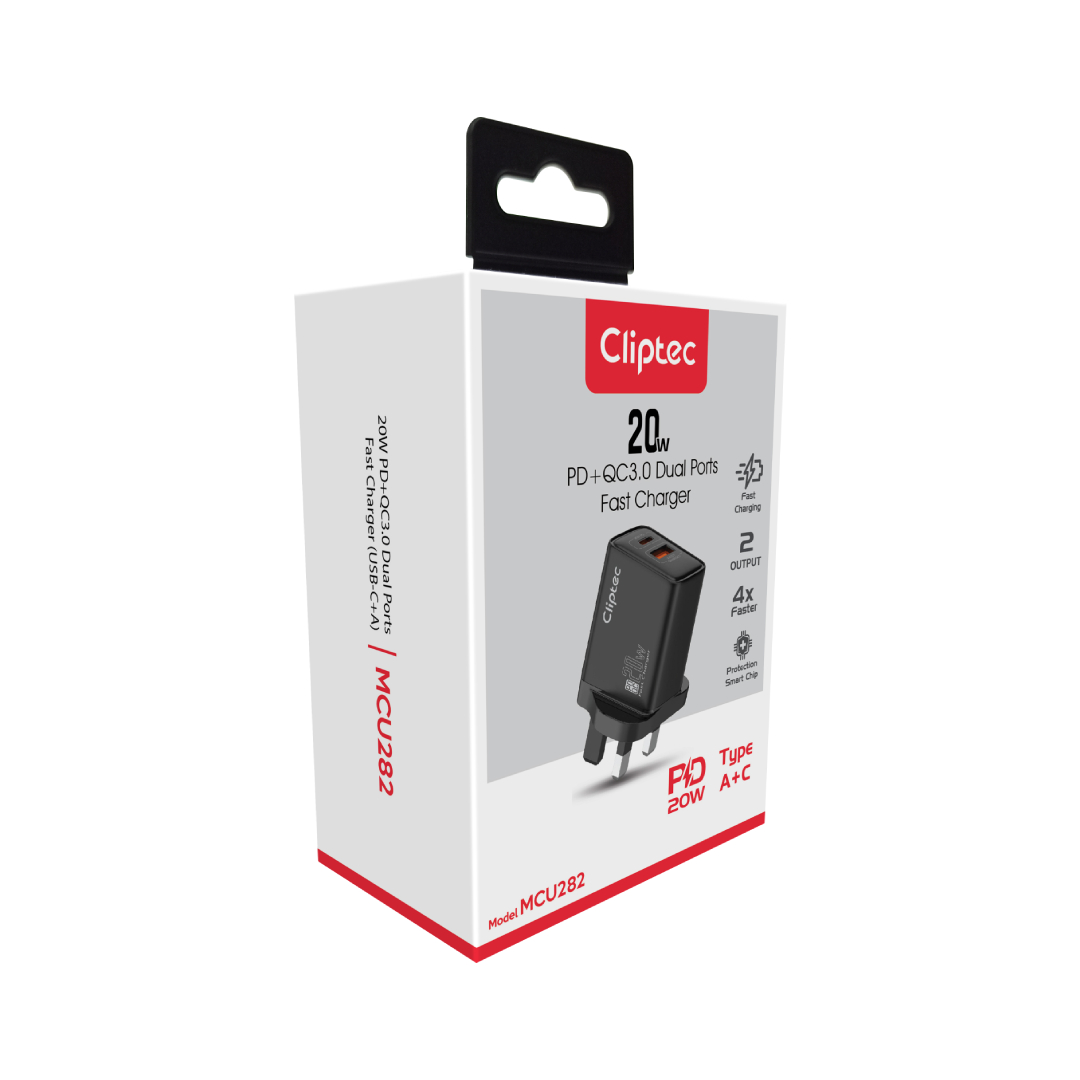 CLiPtec M-series MCU282 20W PD+QC3.0 Dual Ports Fast Charger with USB-C+A port technology allows you to fast charge your smartphone and tablet. The compact and durable design makes it convenient to charge your battery while on the go. You’ll now have more power, more freedom in the traveling road and more convenience than ever before to keep your device powered and charged.