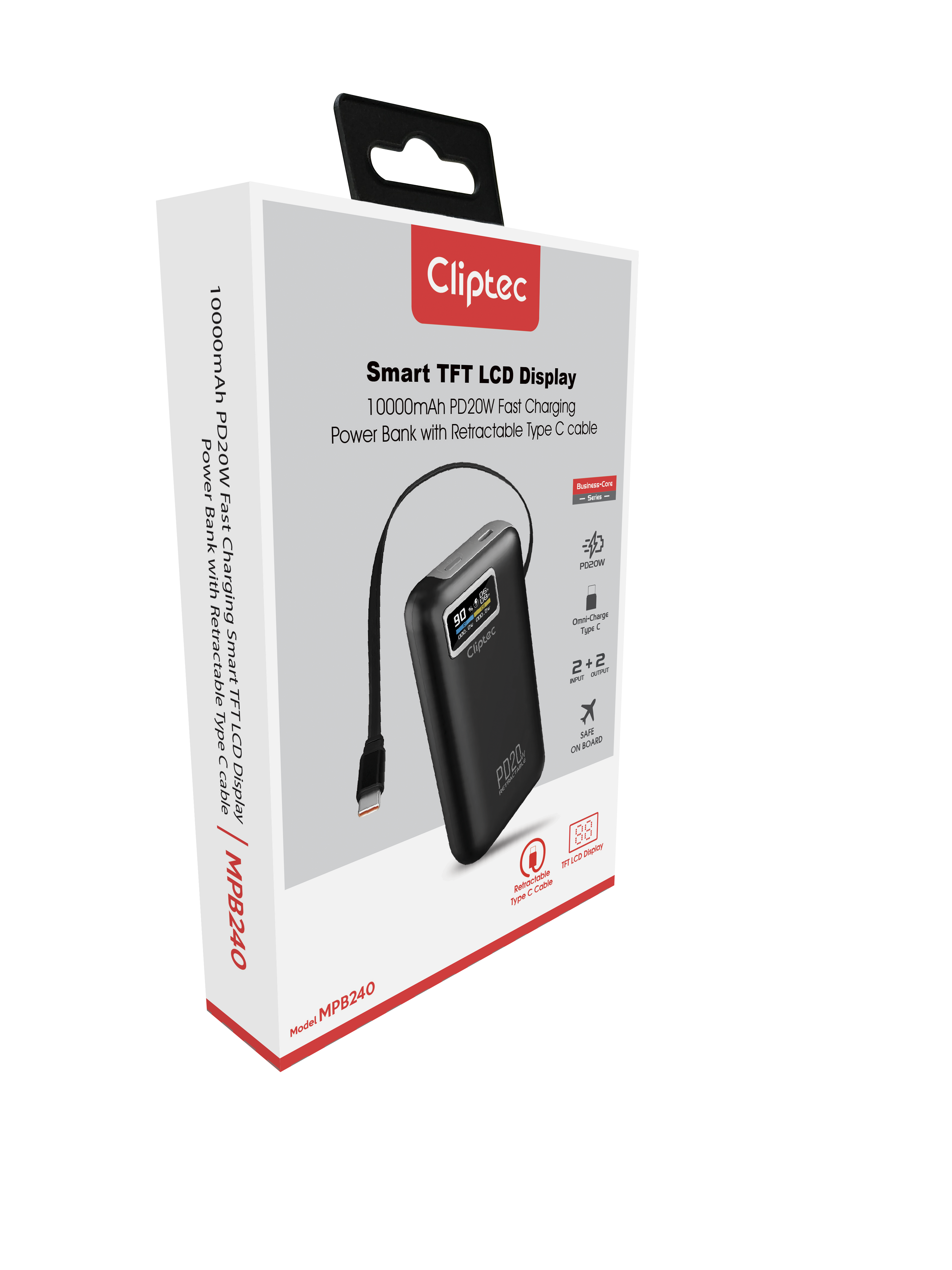 CLiPtec M-series MPB240 10000mAh PD20W Fast Charging Power bank with smart TFT (Thin-Film-Transistor Liquid-Crystal Display) & with fast-charging with 2 outputs - Type C and Type C retractable cable technology allows you to charge your smartphone and tablet at the same time. The compact and durable design makes it convenient to charge your devices while on the go. You’ll now have more power, more freedom in the traveling road and more convenience than ever before to keep your device powered and charged. MPB240 is a grade A 10000mAh lithium Polymer battery, which can prevent over charge and discharge, short circuit, over current and other abnormal conditions, bring more safety. MPB240 featuring an intuitive TFT display, it keeps you informed with real-time info like battery level, power, voltage, and current. Stay in control and stay engaged with your power bank. The graphical display makes understanding its status a breeze. . The power bank comes with a built-in 56cm retractable Type C cable. Pull the retractable Type C cable to adjust the length of the cable, then pull it again to retract and store it. Say goodbye to tangled cables and messy charging environments.