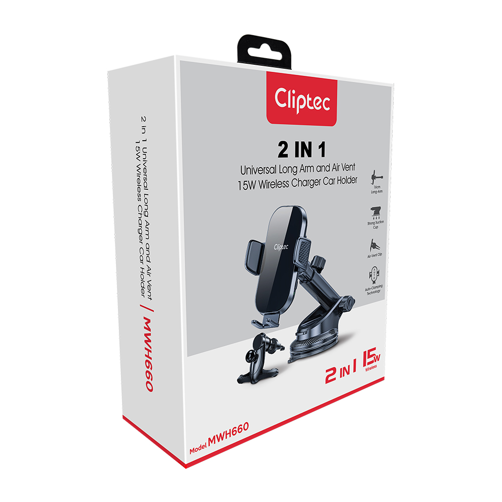CLiPtec 2 in 1 Intelligent 15W Wireless Charger Universal Long-Arm and Air-Vent Car Holder MWH660 is equipped with a suction cup and vent clip, which can be freely mounted on the windshield, dashboard, and air vent for feeding your different usage needs. Experience blazing-fast charging speeds with MWH660 15W Qi wireless car charger. It provides optimized power delivery for various devices: 15W, 10W, 7.5W 5W Qi-enabled devices. Our car phone holder charger features advanced intelligent identification technology, automatically clamping your phone securely in just 0.5 seconds. This phone holder has a 360-degree ball joint and adjustable telescopic arm, which can adjust your phone in any ideal angle without obstructing your view. The telescopic arm can be extended to 16cm. Easily adjust the distance between you and the car mount. The suction with vacuum silicone rubber and thick panels can provide full protection for your phone from scratches and drops even at high speeds, bumps or turns.