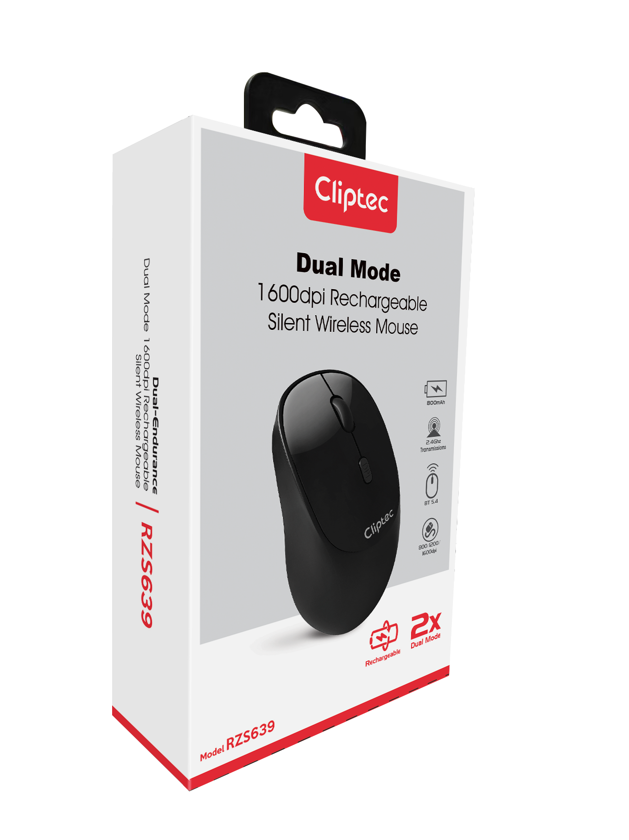CLiPtec RZS639 Dual Mode 1600dpi Rechargeable Silent Wireless Mouse provides great cursor control for browsing documents or Internet pages. The contoured shape is suitable for either hand and the gently curved sides give your hand the support and comfort you need for all-day use. With 2.4 GHz and Bluetooth wireless transmission is up to 10 meter of wireless range give user more freedom, no interference of movement and more comfort and control than a touchpad. Cursor speed is adjustable by the top speed-switching button, one touching to switch between 800/1200/1600dpi, a perfect functionality for wide screen users having the full speed control over the cursor.
