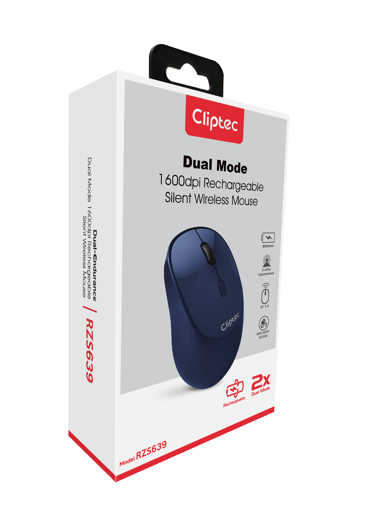 CLiPtec RZS639 Dual Mode 1600dpi Rechargeable Silent Wireless Mouse provides great cursor control for browsing documents or Internet pages. The contoured shape is suitable for either hand and the gently curved sides give your hand the support and comfort you need for all-day use. With 2.4 GHz and Bluetooth wireless transmission is up to 10 meter of wireless range give user more freedom, no interference of movement and more comfort and control than a touchpad. Cursor speed is adjustable by the top speed-switching button, one touching to switch between 800/1200/1600dpi, a perfect functionality for wide screen users having the full speed control over the cursor.