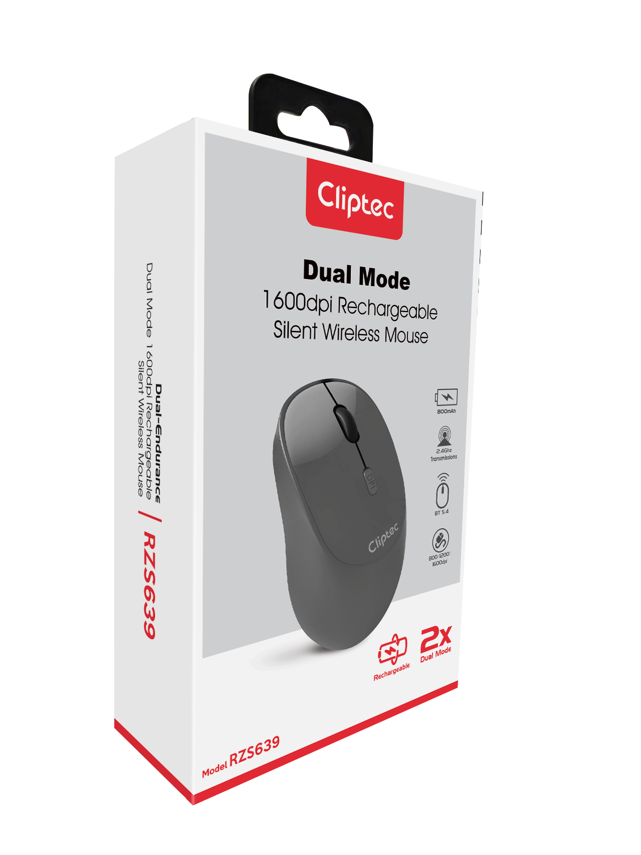 CLiPtec RZS639 Dual Mode 1600dpi Rechargeable Silent Wireless Mouse provides great cursor control for browsing documents or Internet pages. The contoured shape is suitable for either hand and the gently curved sides give your hand the support and comfort you need for all-day use. With 2.4 GHz and Bluetooth wireless transmission is up to 10 meter of wireless range give user more freedom, no interference of movement and more comfort and control than a touchpad. Cursor speed is adjustable by the top speed-switching button, one touching to switch between 800/1200/1600dpi, a perfect functionality for wide screen users having the full speed control over the cursor.