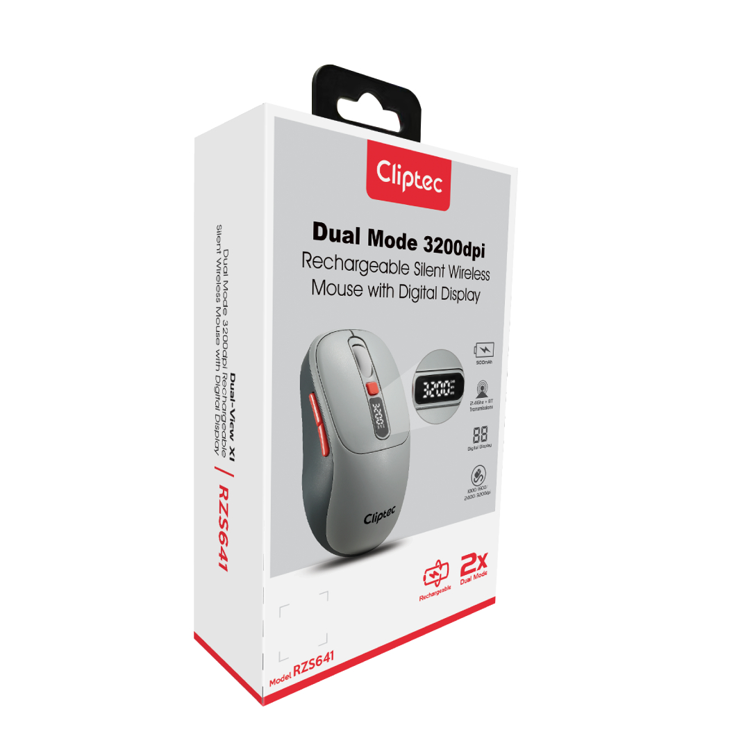 CLiPtec RZS641 Dual Mode 3200dpi Rechargeable Silent Wireless Mouse with Digital Display provides great cursor control for browsing documents or Internet pages. The contoured shape is suitable for either hand and the gently curved sides give your hand the support and comfort you need for all-day use. With 2.4 GHz and Bluetooth wireless transmission is up to 10 meter of wireless range give user more freedom, no interference of movement and more comfort and control than a touchpad. Cursor speed is adjustable by the top speed-switching button, one touching to switch between 1000/1600/2400//3200dpi, a perfect functionality for wide screen users having the full speed control over the cursor.