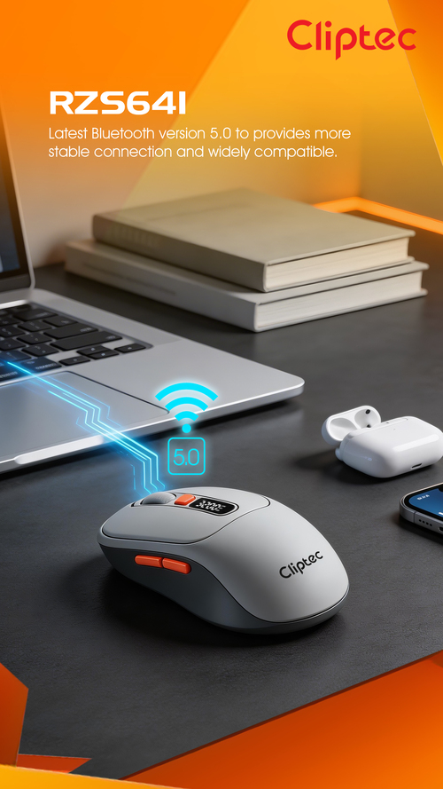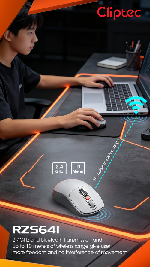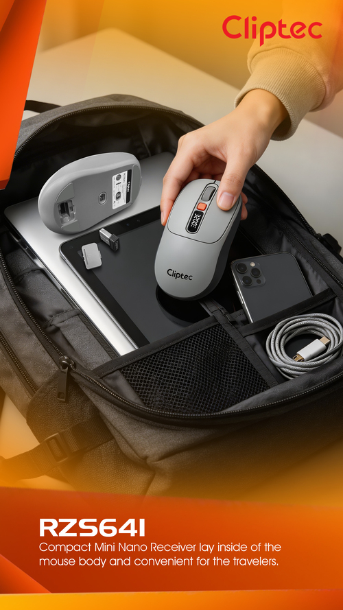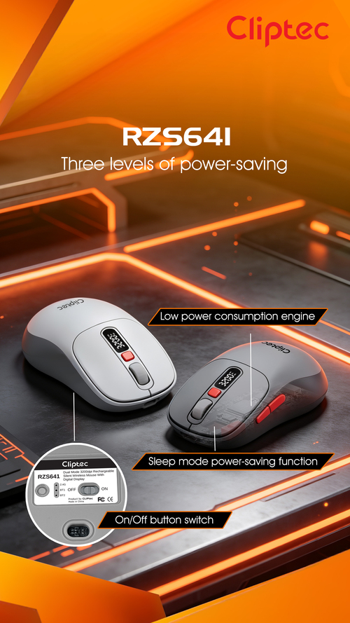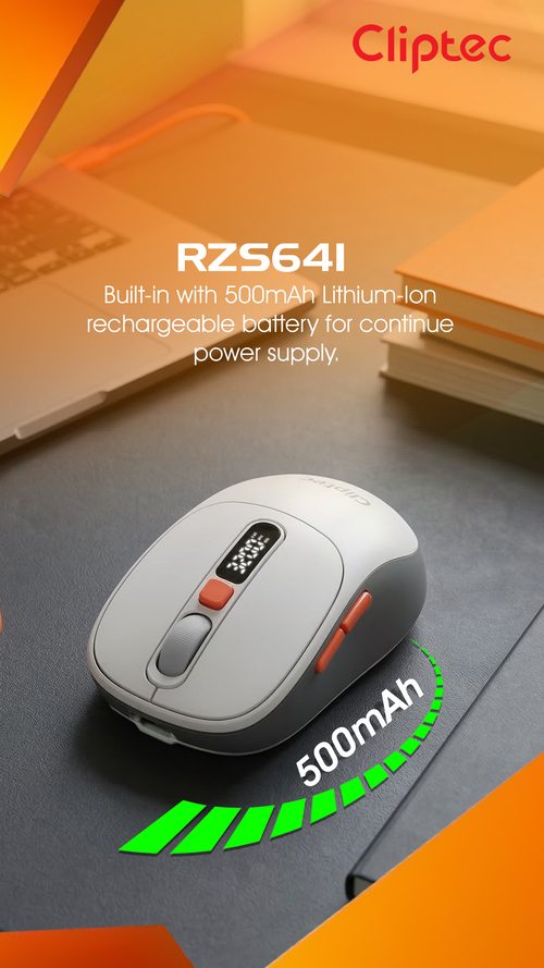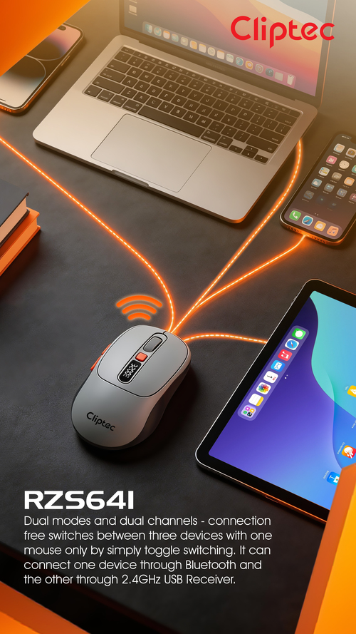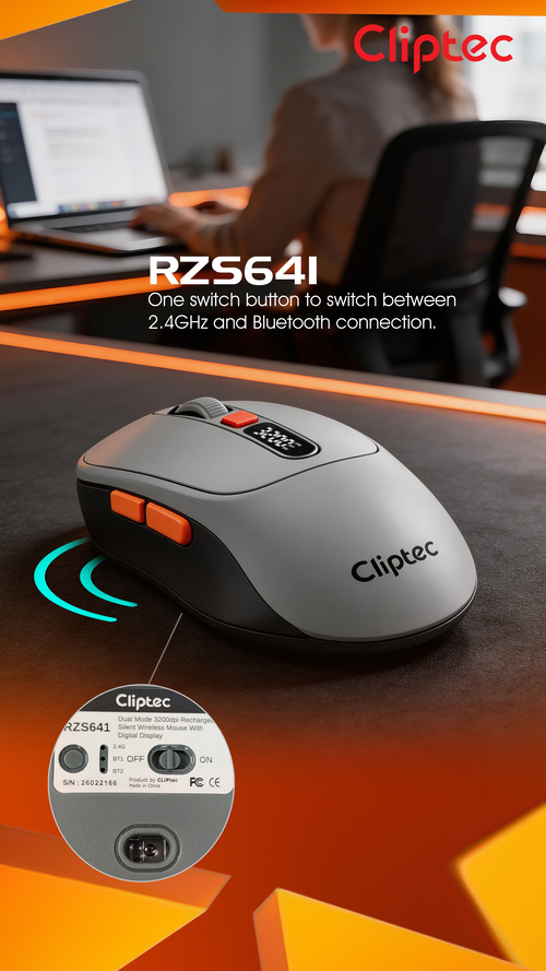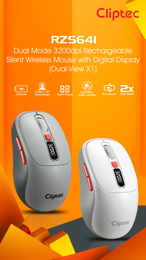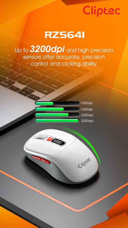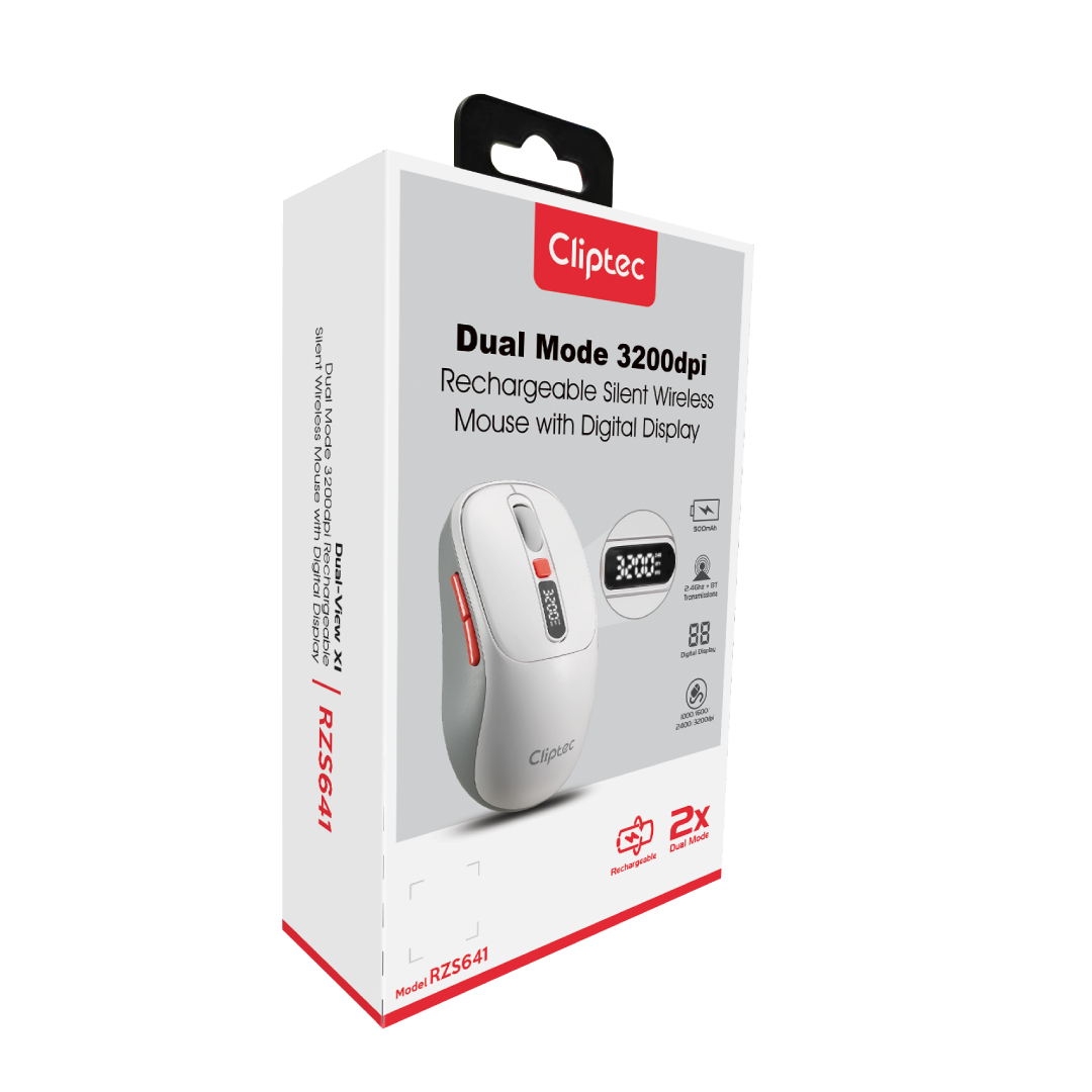 CLiPtec RZS641 Dual Mode 3200dpi Rechargeable Silent Wireless Mouse with Digital Display provides great cursor control for browsing documents or Internet pages. The contoured shape is suitable for either hand and the gently curved sides give your hand the support and comfort you need for all-day use. With 2.4 GHz and Bluetooth wireless transmission is up to 10 meter of wireless range give user more freedom, no interference of movement and more comfort and control than a touchpad. Cursor speed is adjustable by the top speed-switching button, one touching to switch between 1000/1600/2400//3200dpi, a perfect functionality for wide screen users having the full speed control over the cursor.