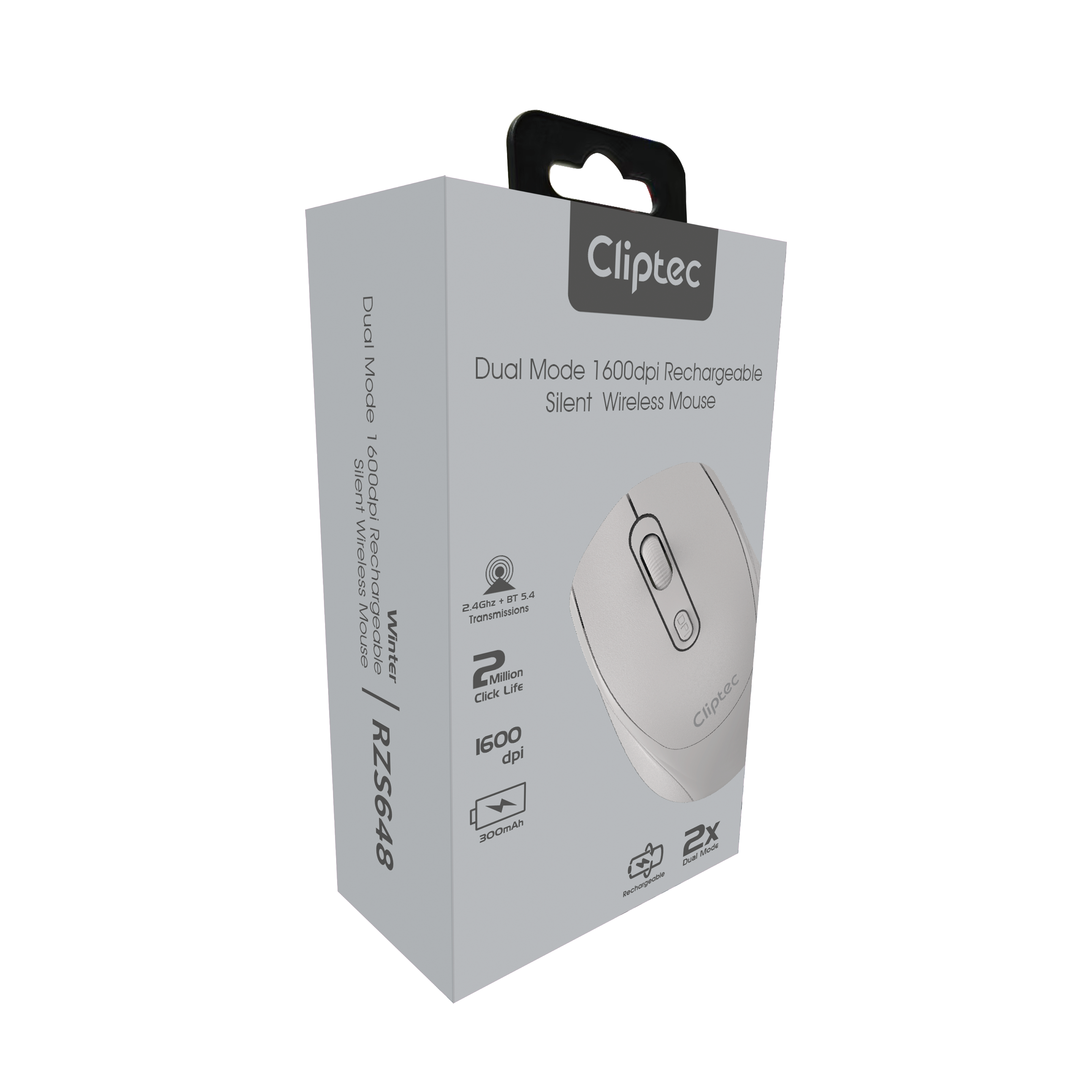 CLiPtec RZS648 Dual Mode 1600dpi Rechargeable Silent Wireless Mouse provides great cursor control for browsing documents or Internet pages. The contoured shape is suitable for either hand and the gently curved sides give your hand the support and comfort you need for all-day use. With 2.4 GHz and Bluetooth wireless transmission is up to 10 meter of wireless range give user more freedom, no interference of movement and more comfort and control than a touchpad. Cursor speed is adjustable by the top speed-switching button, one touching to switch between 800/1200/1600dpi, a perfect functionality for wide screen users having the full speed control over the cursor.